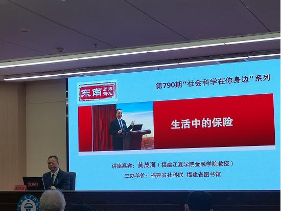 3月16日上午,我院教授、保险学科带头人黄茂海应邀参加由福建省社科联、福建省图书馆主办的东南周末讲坛。本次周末讲坛的主题是“社会科学在你身边”系列之生活中的保险,地点设在福建省图书馆一楼多功能厅,全场座无虚席。