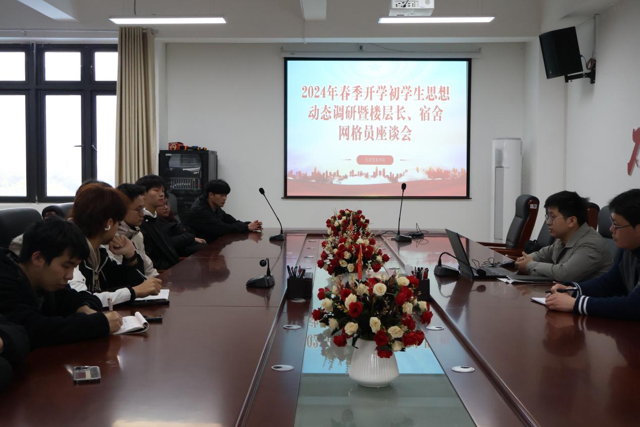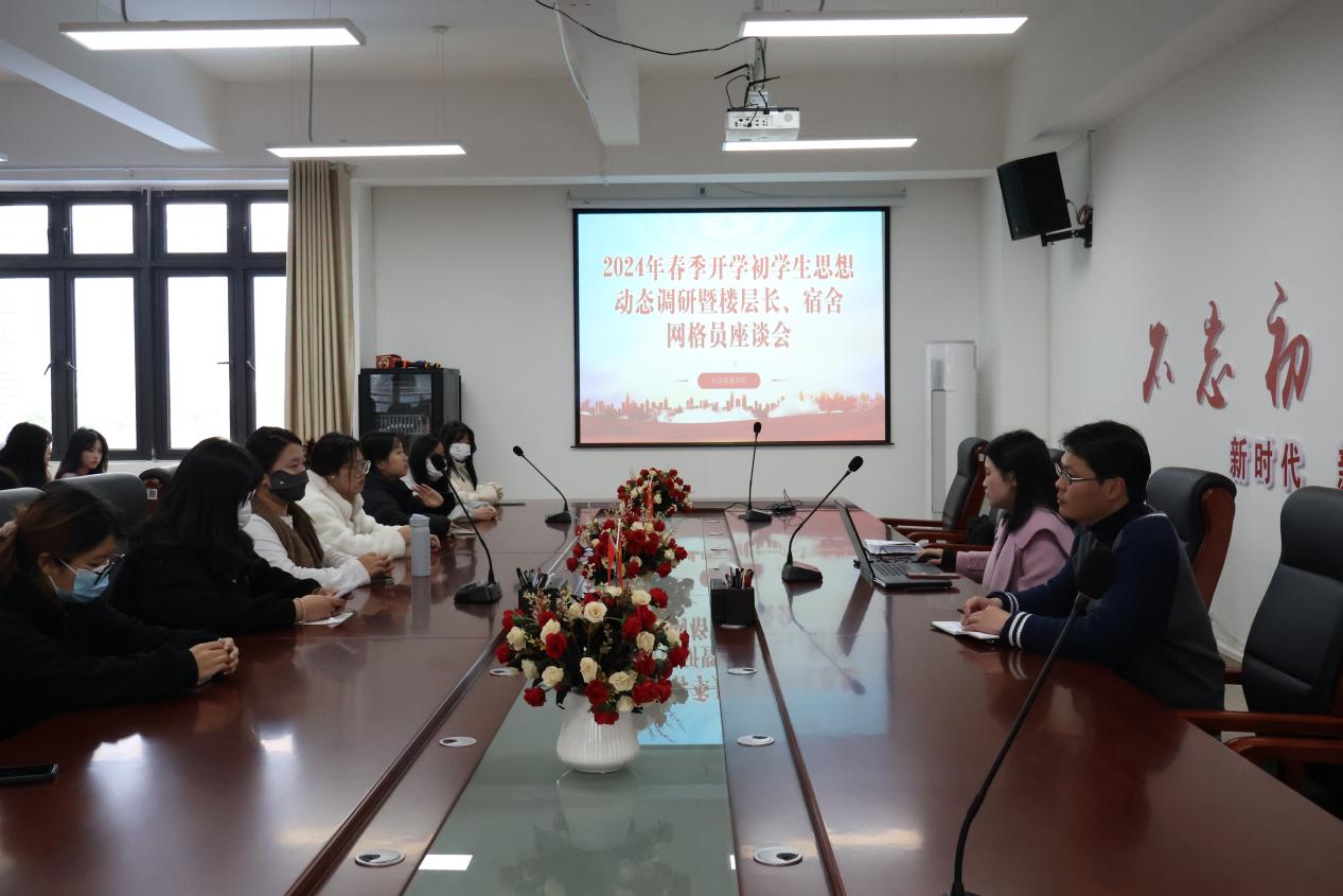 为及时了解和精准掌握学生思想状况以及学生在思想、学习、生活等方面的实际问题,提高宿舍长队伍整体素质和工作能力,进一步提升我院网格化管理水平,共建文明有序、安全和谐的校园环境,为新学期学生思想政治工作针对性、实效性开展提供有益参考和科学依据,3月22日,我院于九号楼424会议室召开春季开学初学生思想动态调研暨楼层长、宿舍网格员座谈会。此次座谈会由汤宁鋆老师和王志锴老师主持,辅导员沈洲、宿舍楼层长和网格员代表参与此次座谈会。