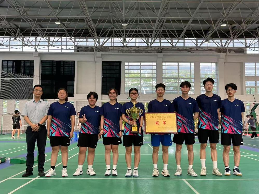 冠军争夺战由工程学院和海峡财经学院打响。比赛十分精彩,随着裁判一声清脆的哨响,羽毛球比赛正式开始。只见发球方选手微微屈膝,眼神专注地盯着对手,左手轻轻抛起羽毛球,右手的球拍顺势划出一道流畅的弧线,羽毛球如流星般越过球网。双方你来我往,羽毛球在空中来回穿梭,速度越来越快。每一次击球,球拍与球碰撞发出的“砰砰”声都扣人心弦。最后工程学院赢得最后的比赛。