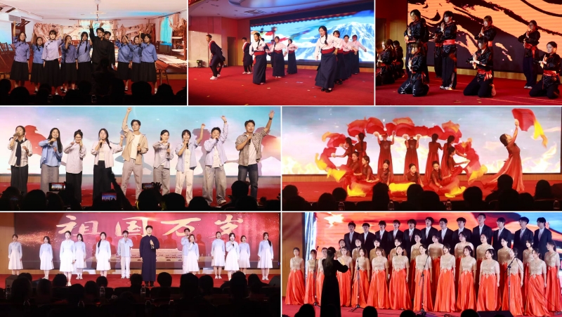 晚会最后,全体师生挥动手中的红旗,共同唱响《歌唱祖国》,雄壮的歌声中饱含对祖国的无限热爱与美好祝福,现场气氛庄重而热烈。
